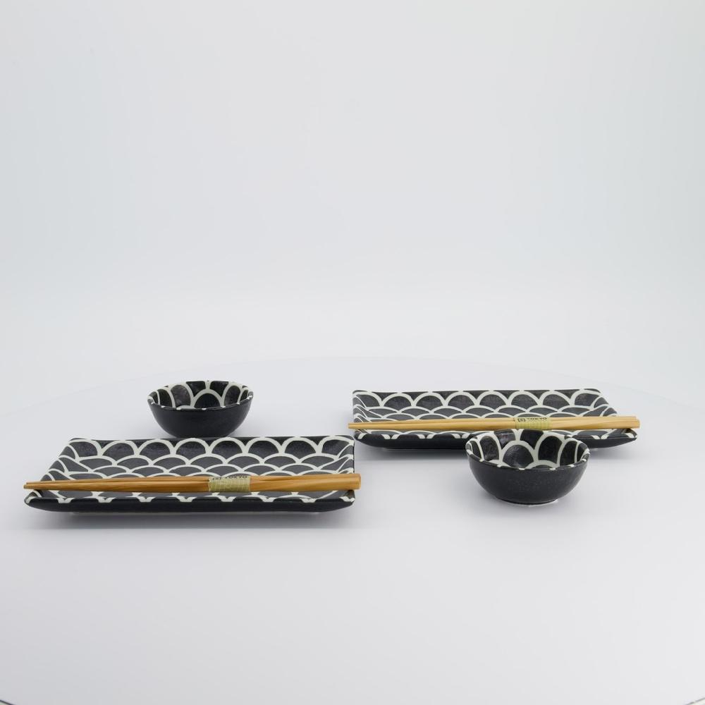 De set bestaat uit 2 rechthoekige borden 21,5 x 14cm, 2 rechthoekige schaaltjes 10 x 7cm voor bijvoorbeeld sojasaus of wasabi en 2 paar houten chopsticks.