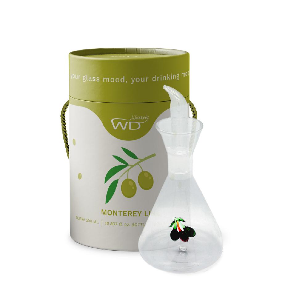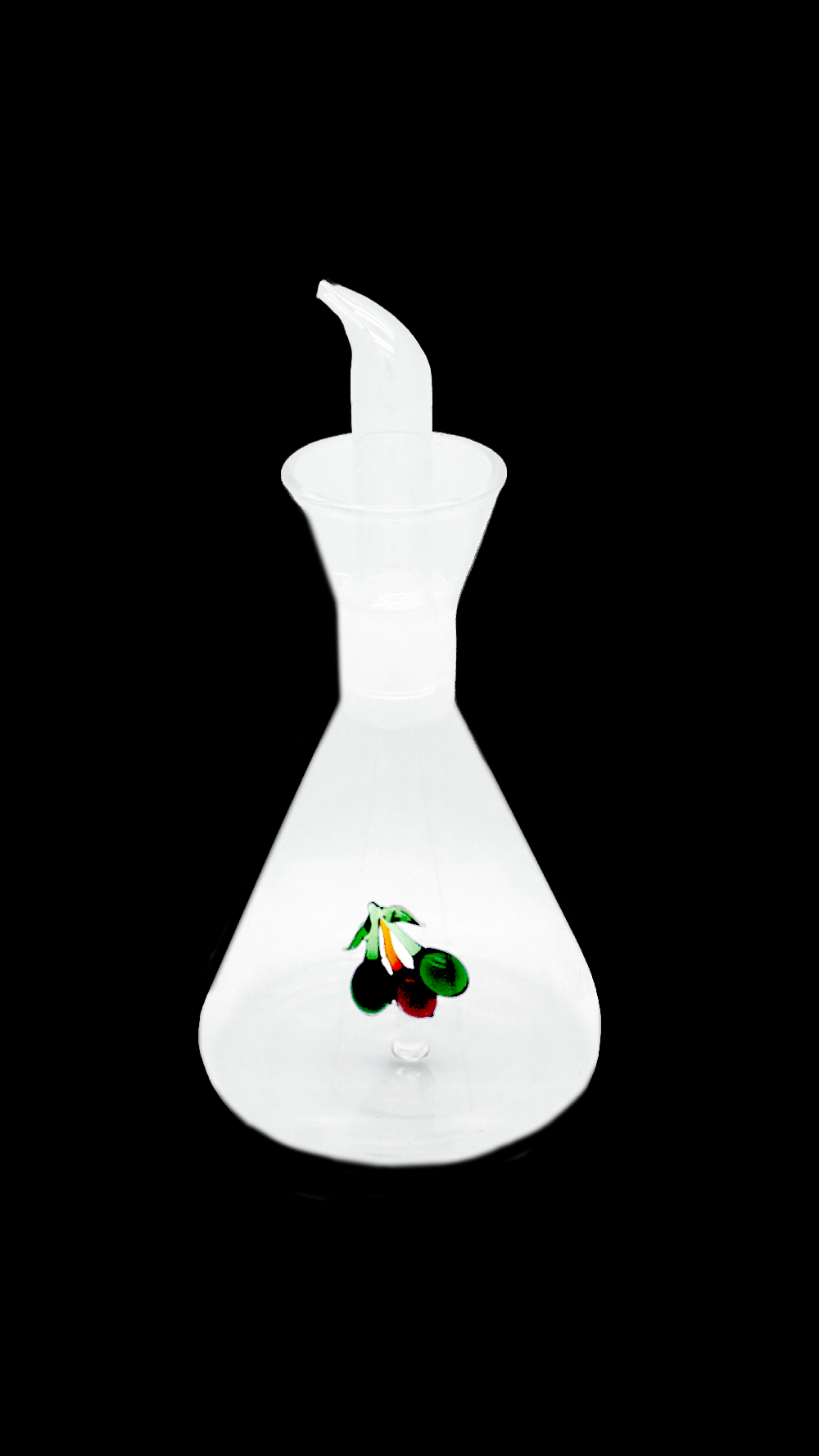 Gesmolten glas wordt in een mal geblazen en vervolgens, terwijl het nog heet is, doorboord om een unieke elliptische holte te vormen. Door dit opvallende gat ontstaat een handvat voor het uitschenken van water of wijn.